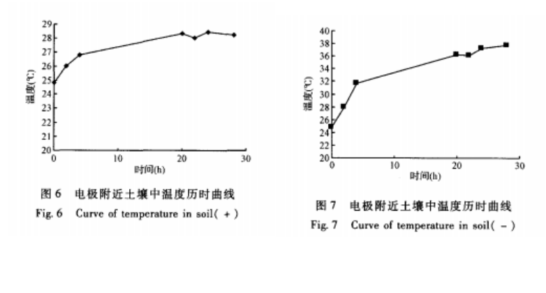 实验开始后电极端见气泡产生且温度升高,土壤的温度变化如图6和图7所示,由图可见,样品中阳极附近温度的变化过程由初始状态的24.8℃逐渐变大最后到达28.2℃,阴极附近温度的变化则由初始状态的24.8℃逐渐变大后到达37.8℃,增加的幅度更大,表现出由阳极到阴极温度逐渐变大趋势。主要原因在于在阴极附近,由于电场的作用初始阶段离子浓度变大,而到后期阶段,阴极附近的pH明显升高而电导率降低,土壤的电阻增大等引起土壤温度上升更快。